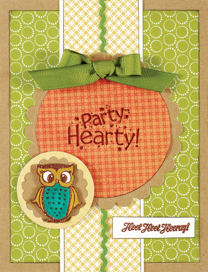 Die cut the 3 3/4” scallop circle from Kraft cardstock and glue to the card center. Die cut a 3 1/4” circle from Happy Days orange circle paper and ink the edges. Stamp and emboss the “Party Hearty” greeting with dark brown bark embossing powder. Glue the orange circle to the scalloped circle. Use Happy Days 1/2” wide green grosgrain ribbon to make a bow and glue to the top of the circle.