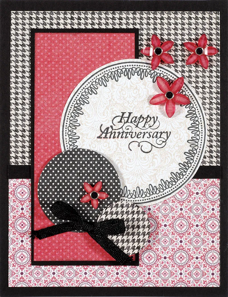 Inside: Ink the edges of 3 1/2”x6” Rosemary & Thyme pink tile paper and glue 1/4” from the card fold. Mat 3 1/2”x4” Rosemary & Thyme pink dot paper with black cardstock, leaving 1/8” border. Glue to the card center, 1” from the card top. Stamp the 1 5/8” circle onto Rosemary & Thyme ivory flourish paper and die cut with the 1 7/8” circle. Glue to the center top of the pink dot paper. Glue and foam tape two 1 1/4” circles below as shown. Glue a flower as shown and place a black jewel Dazzles™ in the center.