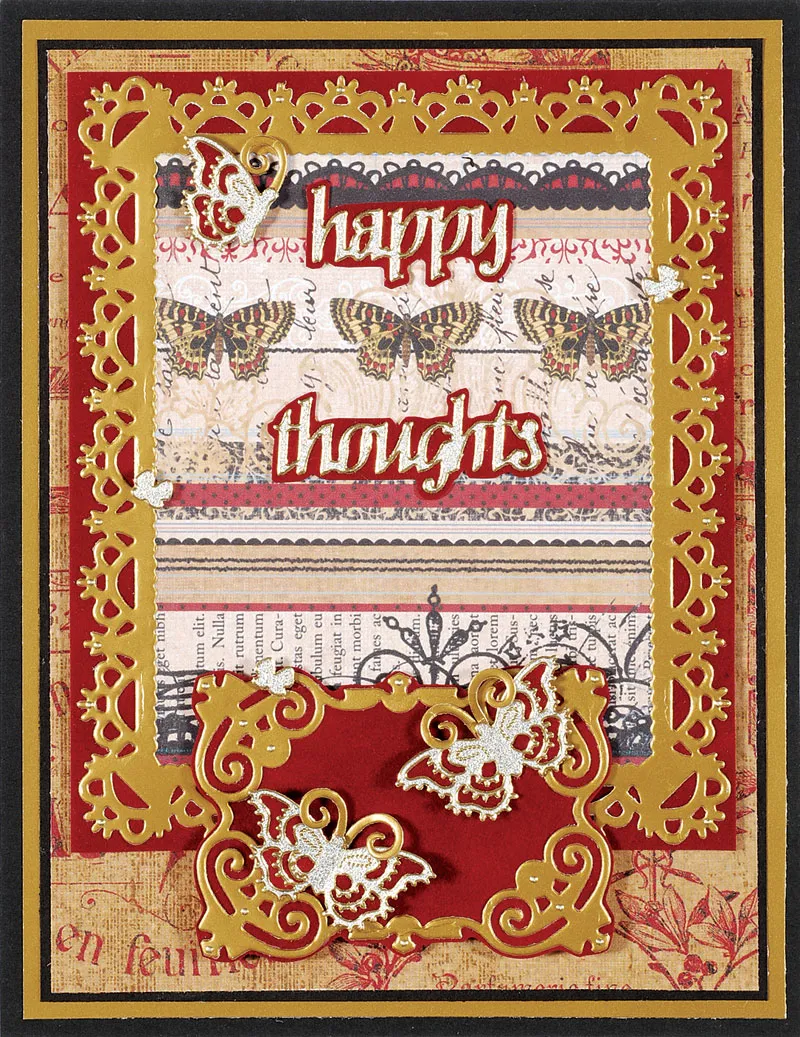 Mat the small gold scroll frame die-cut on suede and cut out 1/16” from the outer edges. Foam tape over lower edge of the large frame. Mat the “happy thoughts” Dazzles™ on suede with a 1/16” border around and place above and below the small butterfly row.