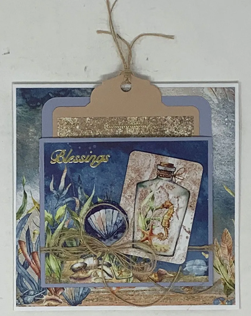 2. Cut 3"x2½" shells on blue cardstock and glue it centered on the outer front of the card pull-out. Open the card pull-out. Cut 3"x2½" underwater cardstock shown and glue it to the lower inside section. Cut 3"x3⅛" Seascapes & Sand sand/shells border cardstock and glue it to the upper inside section. Follow the package directions to construct the pocket pop-out.
