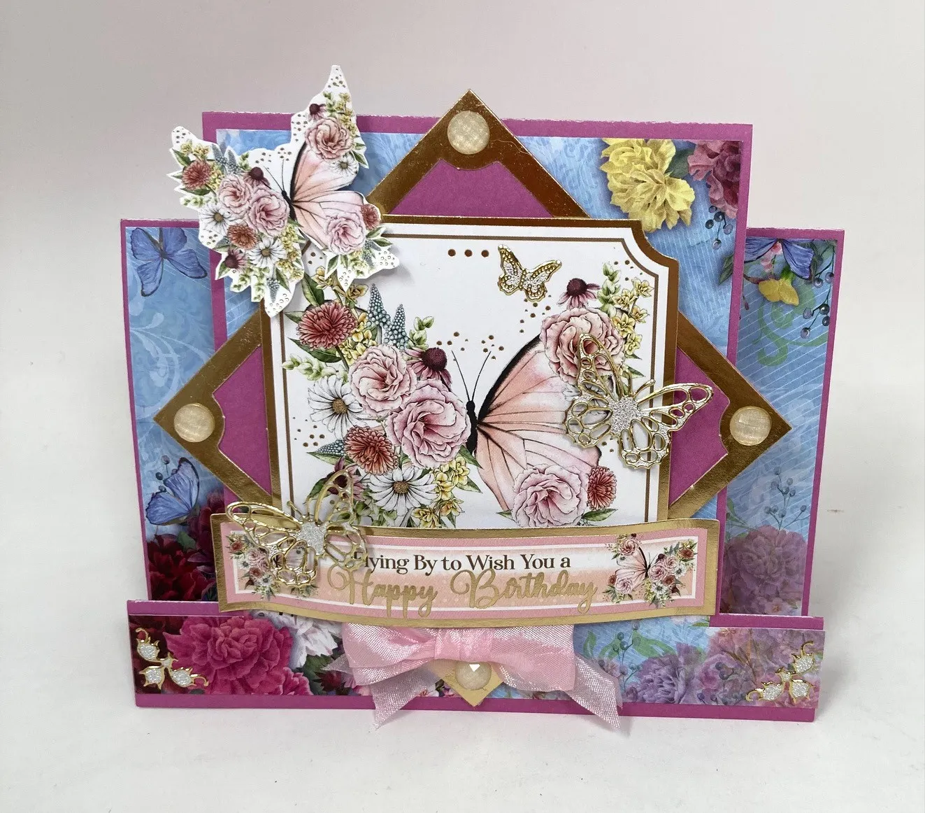 Select the "Flying by to Wish you a Happy Birthday" Topper and use the bone folder to go over the back of it so it bows. Secure the ends with Zots™️ as shown. Place the corner Dazzles™️ from Beautiful Butterflies at the bottom. Place some talc to the backs of the wings on the butterfly Dazzles™️ so they don't stick to the card. Fold the wings up and attach to the front as shown. Place one small butterfly Dazzles™️ flat at the top. Make and Zot™️ a 2" pink bow below the sentiment.