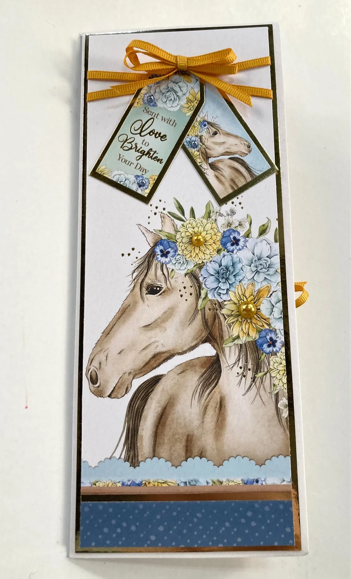 Cut 3 1/8"x8" strip of horse patterned Adorable Scorable from the "Flourishing Florals" collection. Wrap a yellow ribbon crisscross 1" from the top. Make and Zot™️ a 1 1/2" wide yellow bow where they intersect. Foam tape to 3 1/4"x 8 1/4" gold Mirri leaving a 1/8" gold border. Glue to the card front. Glue two of the Topper tags into the bow. Place the gold and blue pearls into some of the flowers as shown.