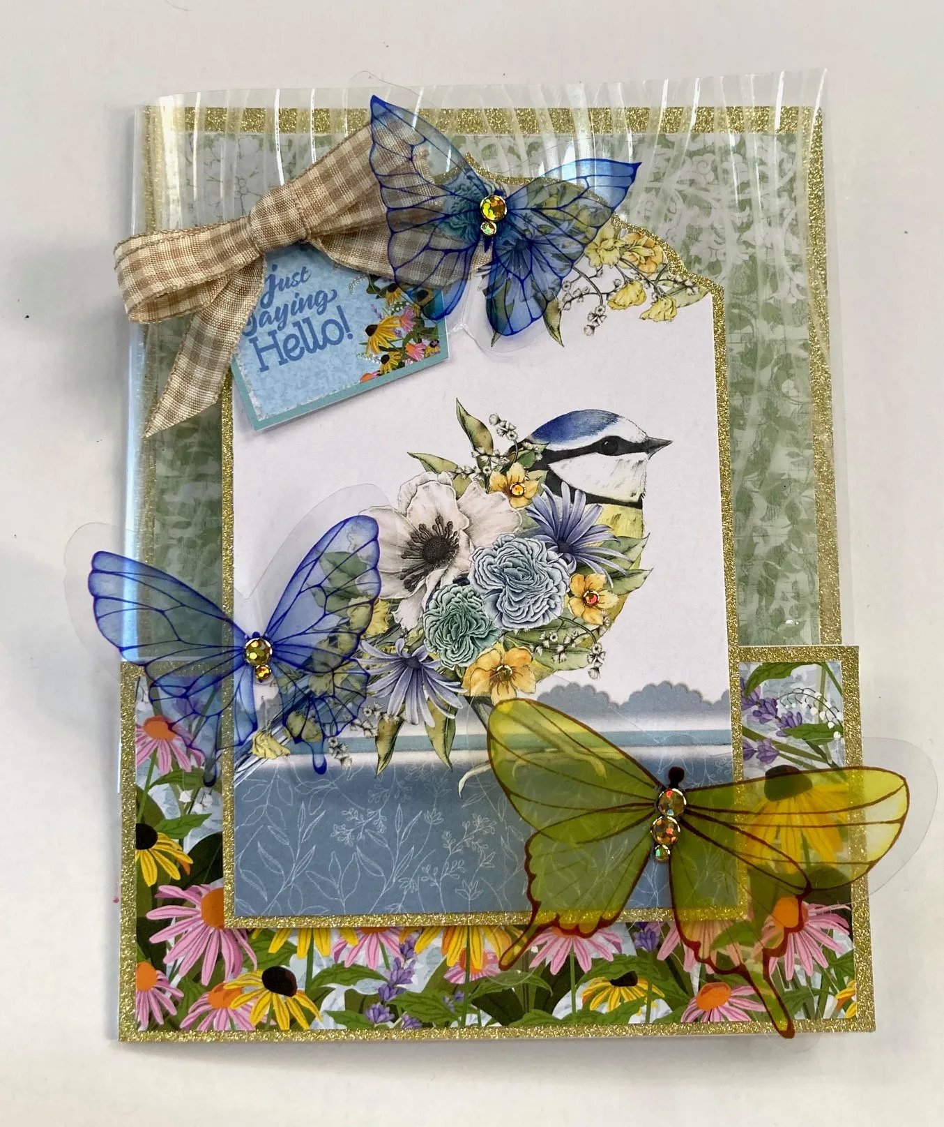 Attach the blue tit tag to shimmer gold cardstock with extra sticky tape and mat leaving a 1/8" gold border. Add foam tape to the bottom area of tag and place centered 3/4" from the card bottom. Cut out "Just Saying Hello" tag from the Secret Garden 6x6 patterned cardstock and glue to the top left of the tag. Make and Zot™️ a 2" wide bow as shown. Place Zots™️ on the bodies of three acetate butterflies, crease the wings along the bodies for lift, and attach to the tag as shown. Place gold Jewel Dazzles™️ on the butterflies and flowers.