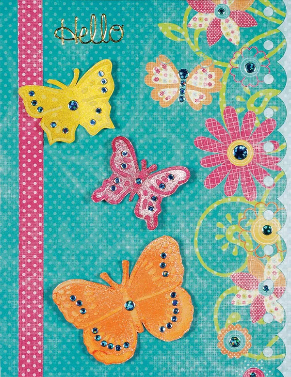 Place small and medium Jewel Dazzlesä on the raised Spackle details. Place more Dazzlesä on the border of flowers and butterfly on the paper.
