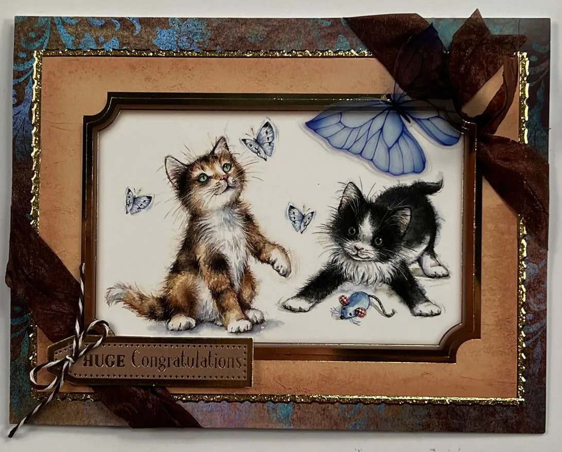 1. For the card front: Place the card with the fold at the top. Cut 6½"x5" blue/brown Damask paper. Separate the butterfly kitties topper from its frame, then glue the frame centered on the Damask paper. Place border Dazzles™ around the outer edges of the frame, trimming the excess. Wrap brown crepe ribbon around the lower left and upper right corners of the paper, knotting the ends at the upper right. Glue the paper to the card front.