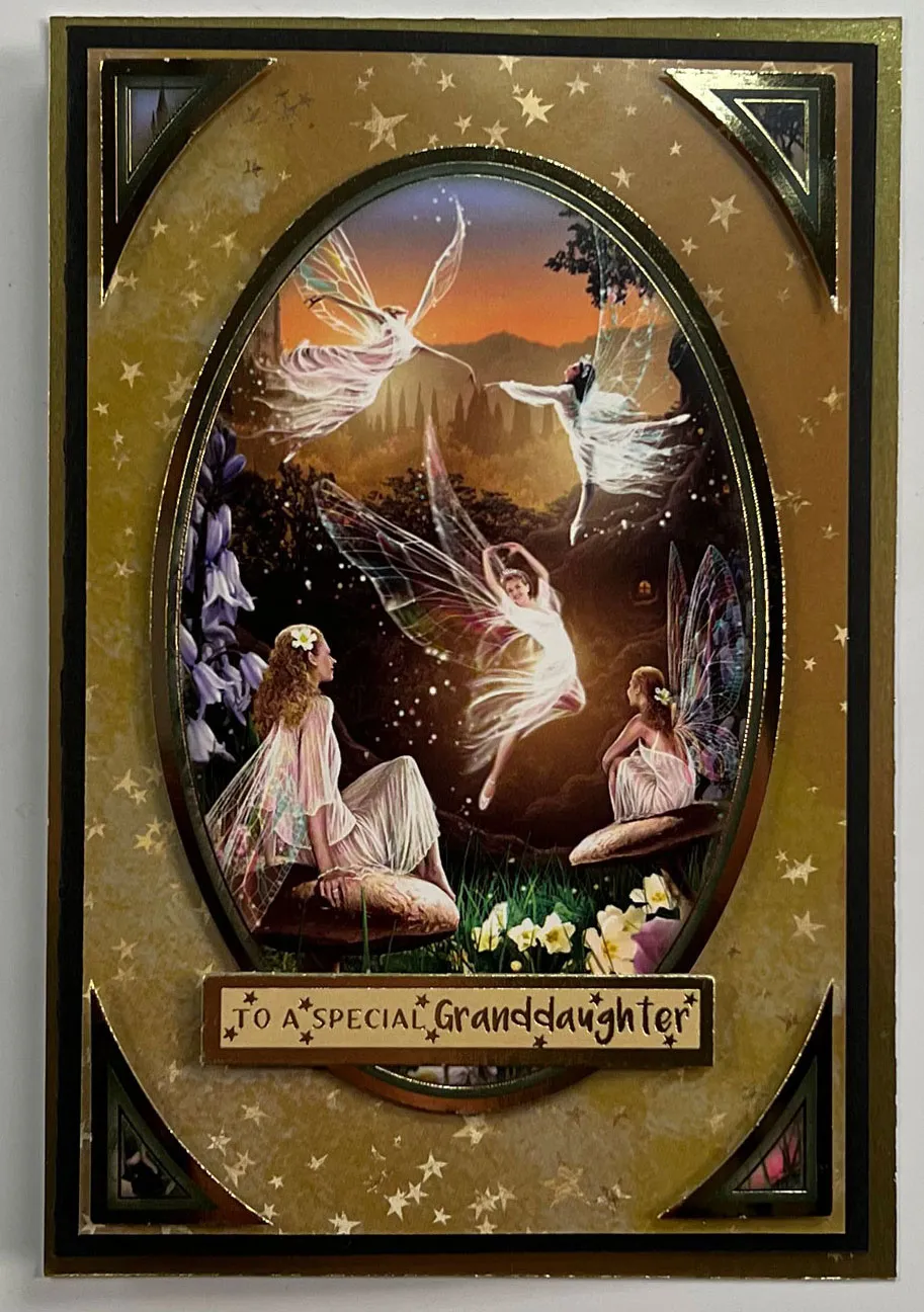 2. For the card front: Cut 3¾"x5¾" gold Starry Night paper and glue it centered on the front. Remove the fairy topper shown from the frame, along with the corners. Foam tape the topper on the center front and the corners as shown. Glue the yellow “to a special granddaughter” label across the bottom of the topper.