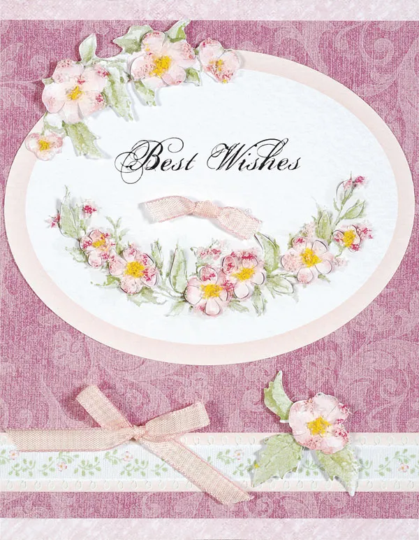 With the card fold at the left, cover the card front with light pink textured paper. Glue a 5” x 6” dark pink flourishes rectangle centered on the light pink textured card front. Glue the die cut floral border across the card front, 5/8” from the bottom. Write or computer print “Best Wishes” on the oval die cut above the flowers. Use the stylus to push the die cut flowers through from the back of the oval, then shape the petals. Repeat for three more die cut flower pieces as shown.