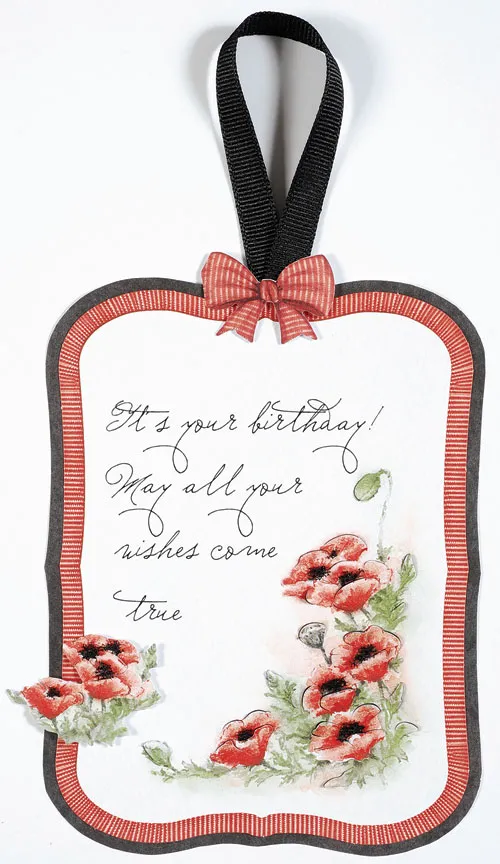 Write or computer print greeting on the left side of the red topper with poppies. Use the stylus to push the die cut flowers through from the back of the topper, then shape the petals. Repeat for a small die cut flower piece.