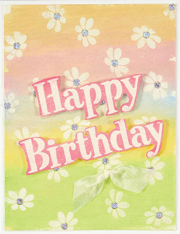Tape off everything but “Birthday” on the stencil. Ink and emboss “Birthday” on a watercolor paper. Repeat with “Happy”. Scribble over both words with Watermelon Gelato. Spritz with water, and spread the Gelato with a brush. Let dry, and rub over the letters with a damp paper towel. Cut close to the letters. Foam tape to the card front at an angle. Zot a white ribbon knot under “Birthday”.