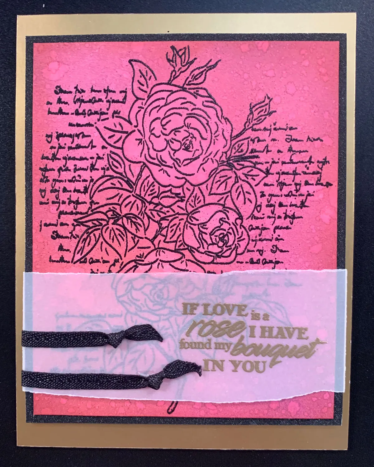 Tear a 2" wide strip of vellum, then trim it to 6" long. With watermark ink, stamp “if love is a rose…” near the right end and emboss it with gold powder. Position the vellum strip across the inked panel near the bottom, fold the ends to the back, and glue them in place.
