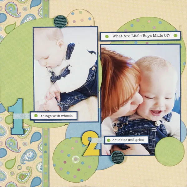 For the right page: Mat a 4"x6" and a 5"x7" photo in blue glimmer paper and glue to the background paper. Add rub-ons to two Great Big Brads™ and insert near the larger photo. Glue a 3" circle over the edge of the larger photo.