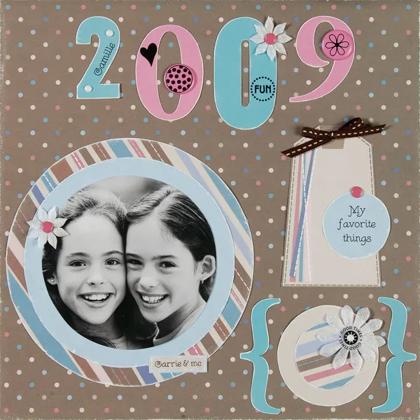 Journal "My favorite things" on the 2" blue circle, glue to the large tag, insert a brad at the top and glue to the page. Attach a ribbon bow to the top of the tag. Layer the 3" tan and 2" stripe circles and glue below the tag. Glue sanded brackets on each side.