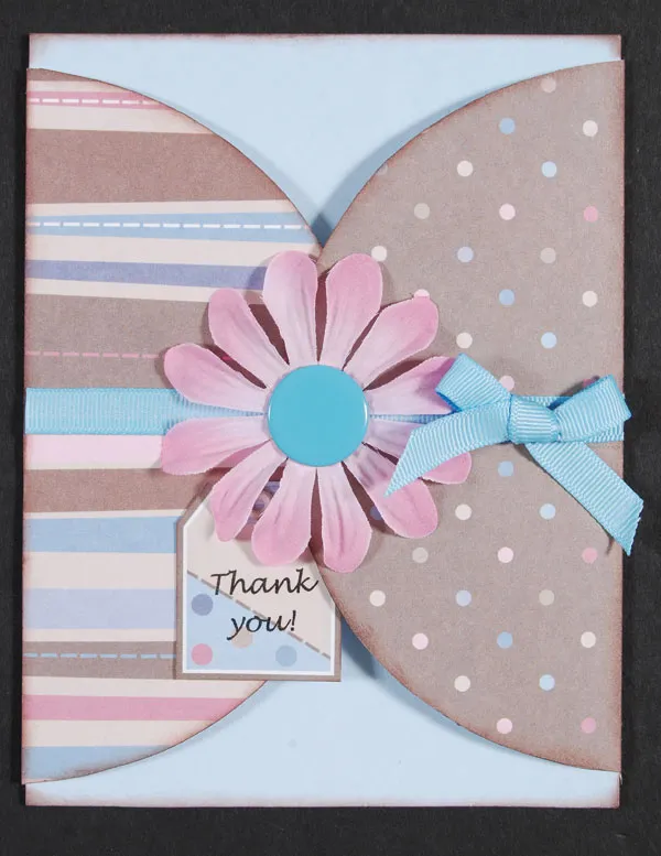Trim the front of two 5"x6 ½" cards using the 6” half circles. Glue the backs of the cards together to overlap the trimmed fronts. Cover the flaps with brown dot paper and blue, brown and pink striped papers.