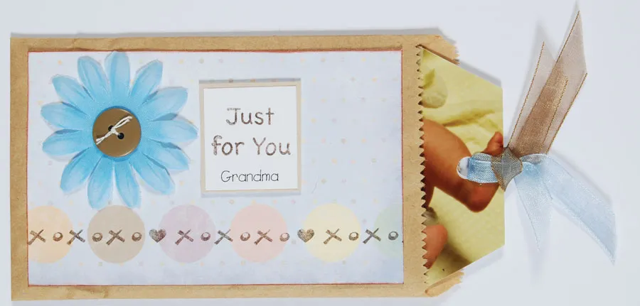 For the Bag: Cut a 2 ¾"x4 ½" of dot paper, ink the edges and stamp a border along the bottom. Threads a button with white floss and attach over a small blue flower. Attach to the top left of the bag. Stamp "Just for You" over "Grandma" text, trim and mat with tan paper. Attach with foam tape to the left of the flower.