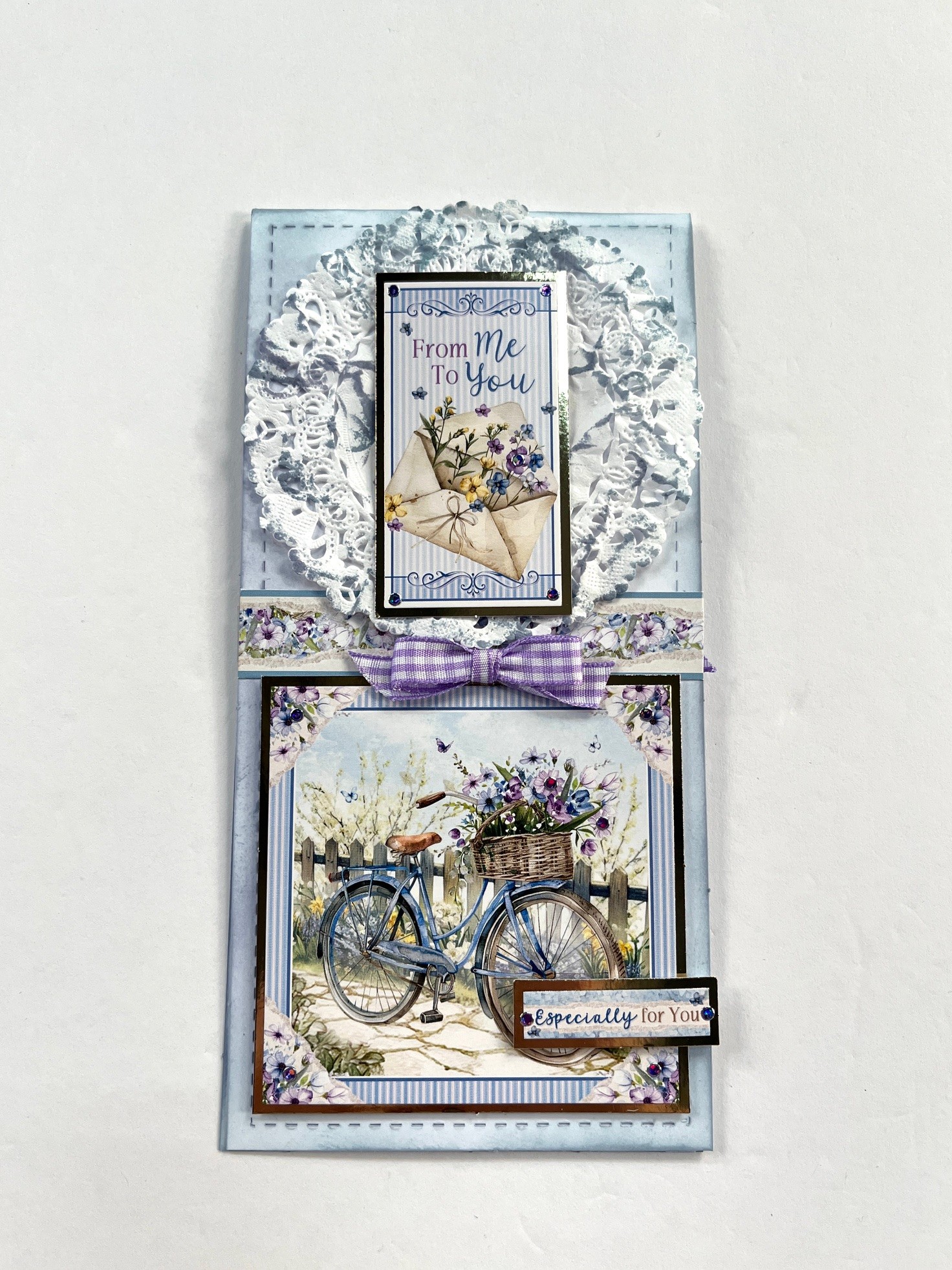 Foam tape “From Me To You” die-cut in the doily center. Trim off 4” length of cutout border piece and tape 3 3/4” from the bottom. Foam tape bicycle die-cut directly below the border leaving 1/4” inked borders.