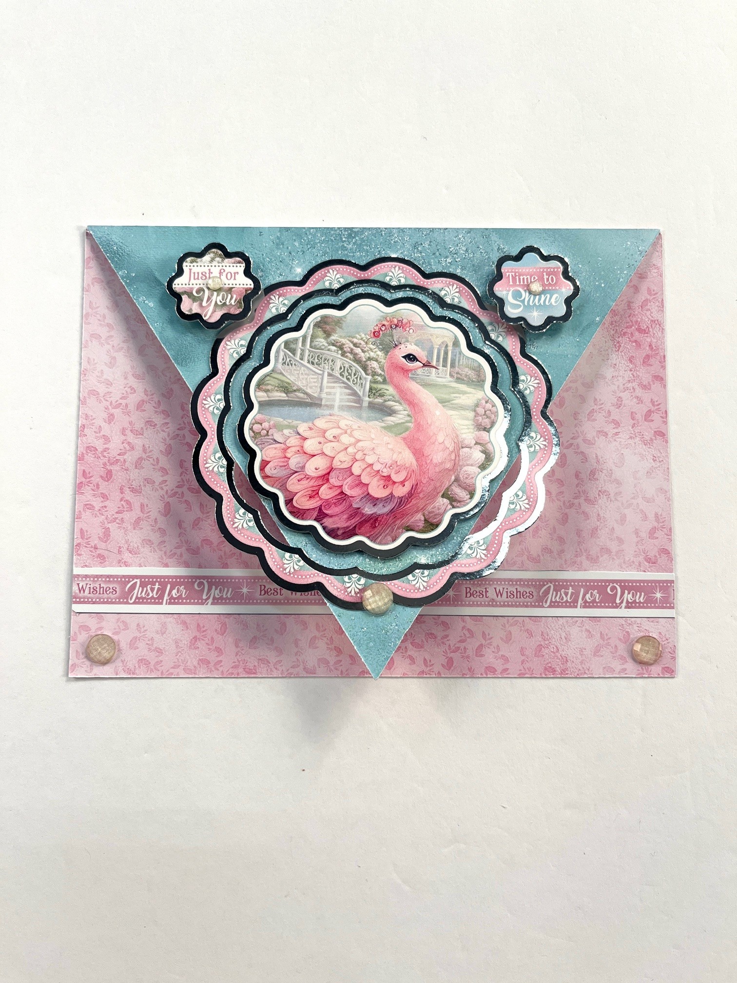 Card inside: Cover inside with tape, lay pink paper on top flush to fold and one side, then trim off the excess. Foam tape the sentiment die-cut centered 2” from either side and 1/2” from top hiding under the triangle. Tape border cutout 1/2” from the bottom. Place crystals as shown.