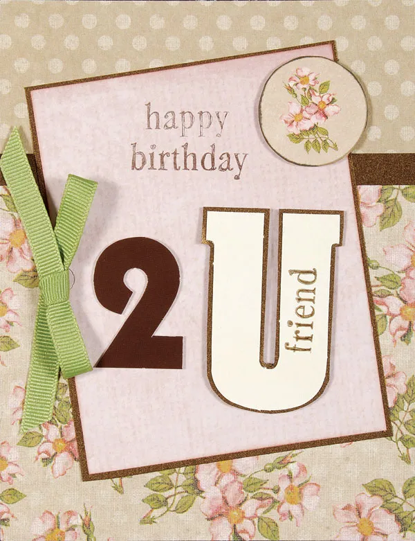Cut a 3 1/2"x4 1/2” pink rectangle and ink the edges. Mat with bronze glimmer, leaving a 1/16” wide border. Glue at an angle to the card front. Stamp “happy birthday” at the top of the rectangle. Mat the “U” with glimmer paper and stamp with “friend.” Foam tape the “U” and glue the “2” to the card front, as shown.