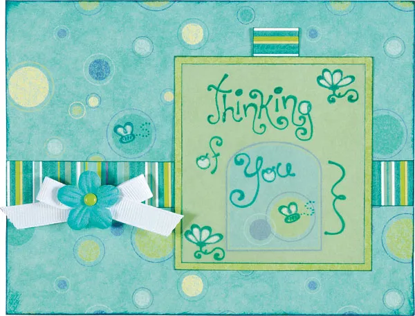 Fold a 2"x3/4" piece of striped paper and ink the edges. Add as a tab to the back of the lime paper. Glue to the right side of the card, overlapping the striped paper strip. Stamp a bee over a circle in the background of the card as desired. Add a white bow to the front. Attach a small flower with brad over the center of the bow. Add white chalk or pencil to the open spaces of the stamped images.