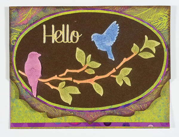 Trace and cut a 6½”x4” oval on brown cardstock. Tape off all but the large branch and bird on the stencil. Place the stencil on the oval, and tape it in place. Use the squeegee to apply embossing paste over the branch and bird. Remove and wash the stencil. Use the brush to apply Sapphire Mica Powder to the bird. Tap off the excess, being careful not to get the blue powder on the branch. Use the brush to apply Kiwi powder on all of the leaves. Tap off the excess, being careful not to get the green powder on the branch. Cover the branch with Nouveau Orange Mica Powder. Heat from the top with the heat tool, until the paste begins to bubble and crackle. Tape off all but the sitting bird on the stencil, and carefully tape the sitting bird so it is sitting on the branch. Squeegee Embossing Paste over the bird. Brush with Plum Royale Mica Powder, and heat until bubbly.