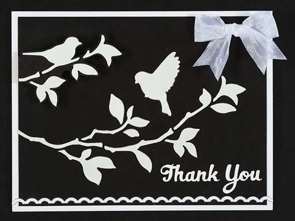 Place border Dazzles™ along the bottom and “Thank You” Dazzles™ as shown. Zot™ on a bow of white crepe ribbon, as shown.