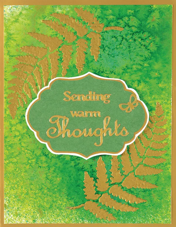 Card inside: Mack off the large stencil and place the small fern in the bottom right corner. Cover the rest of the card so the spay will not travel. Spray the fern. Let dry. Trace and cut an Exquisite Label on green cardstock. Mat on gold metallic paper with 1/16” borders. Place the Gold Greeting and small flower Dazzles&trade,; and glue to the card.