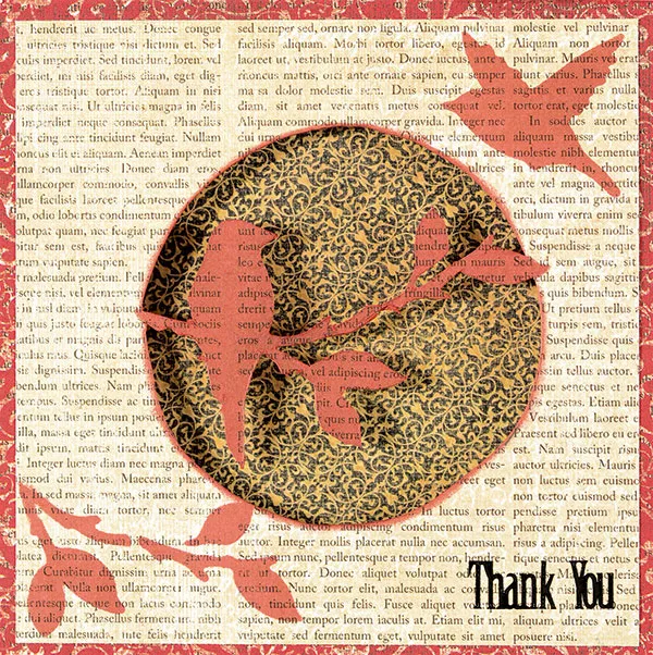 Use the Easy Circles Template to trace a 3” circle around the inked bird on the branch. When cutting the circle, remember to leave both sides of the branch connected to the card. Cut around the bird and branch. Isolate the flying bird, and ink on the top right corner. Isolate the branch that the bird is sitting on, and ink on the bottom left corner. Place the “Thank You” Dazzles™ on the bottom right corner.