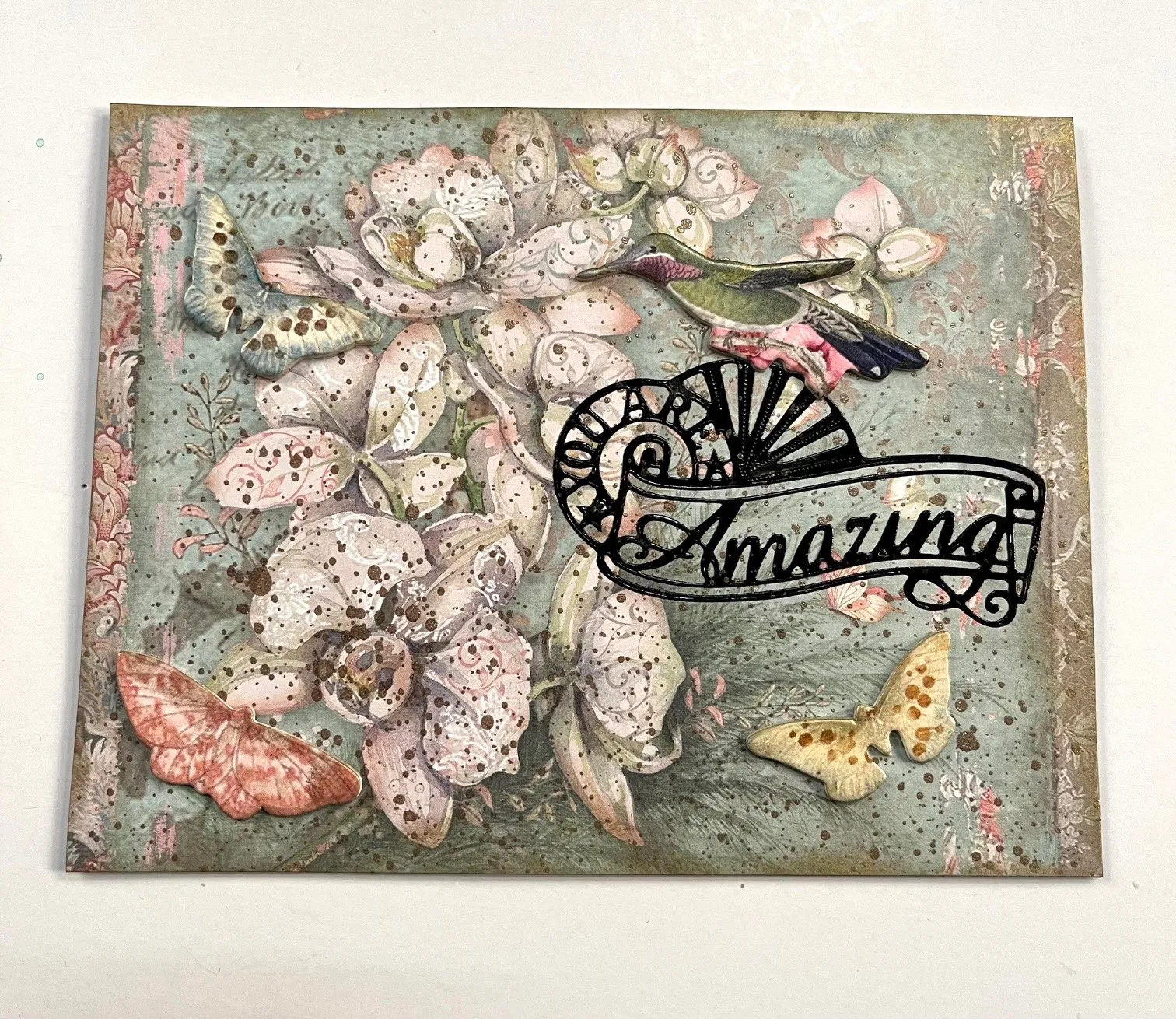 2. Place “You Are Amazing” from Big Greetings Dazzles™ stickers as shown. Select the three butterfly and one bird Die-Cuts. Use the Gold ink pad on the edges of each. Glue to the card as shown.