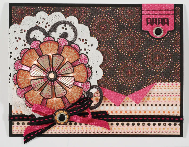 Glue a doily to the front with ½" extending off the left edge and trim the excess. Follow the package directions to punch and assemble the swirl Tangerine flower papier tole piece, placing foam tape between the layers. Glue to the doily, offset as shown. Hold both ribbons together to make a 4-loop bow and tie the center with thread. Attach below the papier tole flower with tape.