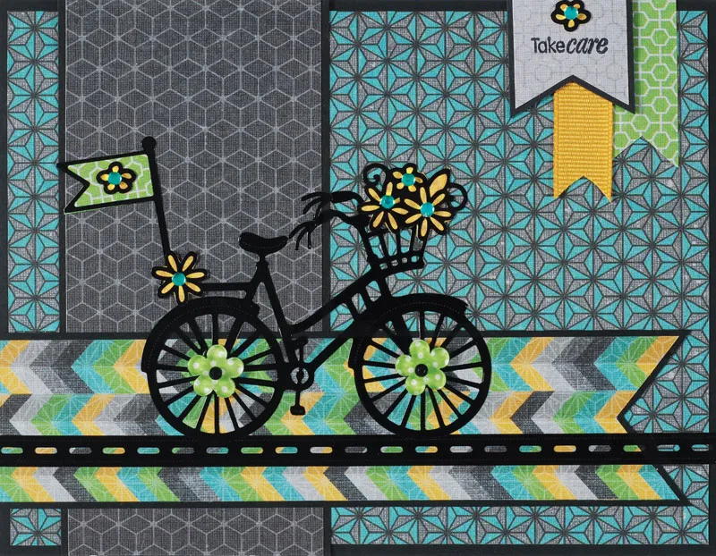 Use the pattern to trace and cut Banner A from Geometrics chevron paper. Mat on cardstock with 1/32" borders, then glue extending from the left edge, 3/8" from the bottom. Place the Dazzles™ border across the lower front, ¾" from the bottom and trim the excess. Place a 3"x2" Dazzles™ bike on the front as shown.