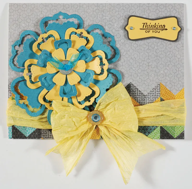 Die cut a 4¼" and a 2¼" bloom from blue cardstock. Die cut a 3¼" and 1½" bloom from yellow cardstock. Gently curl the petals with your finger or the edge of a bone folder. Stack largest to smallest and glue together. Glue to the front, next to the left edge.