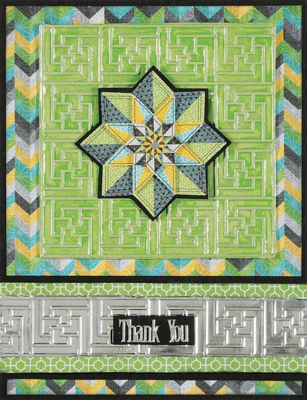 With shiny side up, fold a sheet of aluminum foil into 4 layers, measuring the size of the embossing folder, or 4”x6”. Place in the folder and emboss using die cutting/embossing machine. Cut out a shape of 16 squares and apply Mowed Lawn Distress Paint. Remove excess paint from raised surfaces using paper towel. Let dry and Zot™ to the card center, 3/8” from the top. Assemble the Geometrics Papier Tole with foam tape. Mat tole with black cardstock, leaving 1/8” border and foam tape to the foil. Place a silver star from Silver Tiny Words & Phrases Dazzles™.