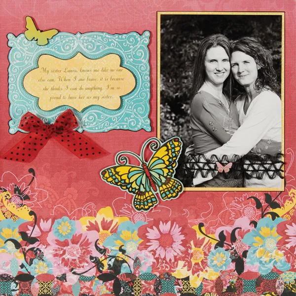 EMBELLISHING with Mirage Die-cuts and Ribbons: Cut a length of Black double Organdy cord to fit and Zot™ it across the photo, 1/2" from the bottom. Foam tape the large blue/yellow/red butterfly die-cut angled over the lower right corner of the photo and ribbon. Mat the small yellow and pink textured butterfly die-cuts on black cardstock with 1-16” borders. Foam tape the yellow one overlapping the sanded blue embossed journaling frame, and the pink one centered on the black double organdy cord as shown. Use 3/4" wide red/black dot organdy ribbon to tie a bow. Zot™ on the edge of the journaling frame as shown.