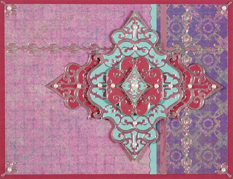 For the card front: Turn the card with the fold at the top and cover the front with plum cardstock. Cut 6¼"x4¾" Batik pink paper and 2"x4¾" Batik purple damask paper. Mat the left long edge of the purple paper on aqua cardstock with a ¼" border, then trim with the scallop-edged scissors. Glue the purple paper to the pink paper, aligning the right edges. Glue the paper centered on the card front.