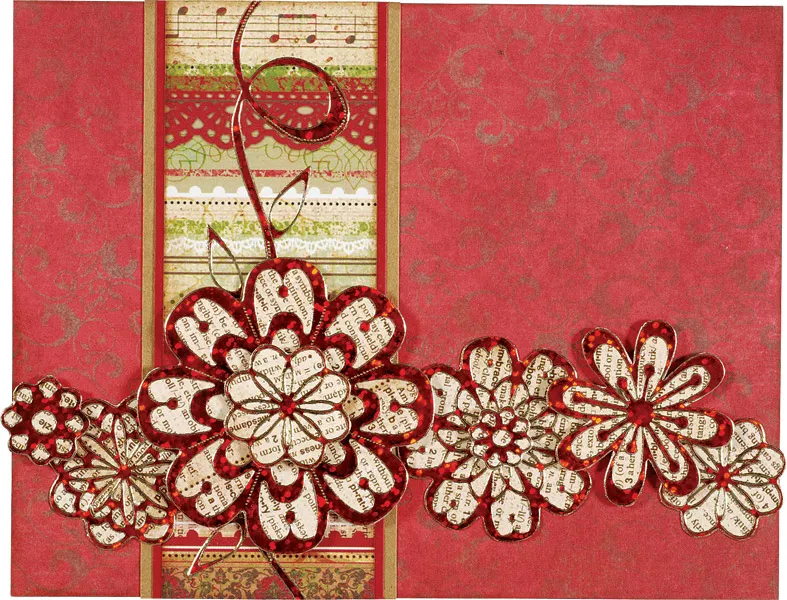 Place the stem Dazzles on the center of the striped paper, trimming as needed to fit. Place eight flower Dazzles™ on Roses in Harmony text paper and cut around the edges. Glue and foam tape six ¾"-2½" wide flowers in a row across the front as shown, then foam tape small flowers in the centers of the two largest flowers. Place leaf Dazzles™ next to the stem and largest flower.