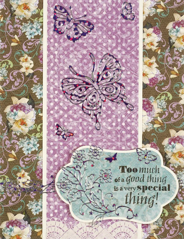 Trace and cut a 3½" inner label from Enchanted Moments blue paper. Stamp “too much of a good thing…” on the right end, then mat on cardstock with 1/16" borders. Place the Dazzles™ as shown on the label, then foam tape it to the lower right. Place the remaining butterfly Dazzles™ on the purple strip as shown.