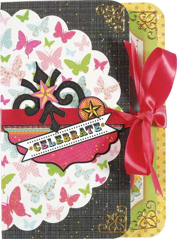 For the card front: Open the card and score ½" right of the center score line. Score ½", 1", and 1½" left of the center score line. Accordion-fold on all the score lines. On the outside, use tape to secure the folds, creating a card with pop-up sections on the inside. Cut Confetti Cake black paper to cover the front and glue the glittered half-circle butterfly note to it, aligning the right edges. Glue the end of a 12" ribbon to the left back edge and wrap it to the front. Glue the paper to the card front, then trim the right corners with the punch.