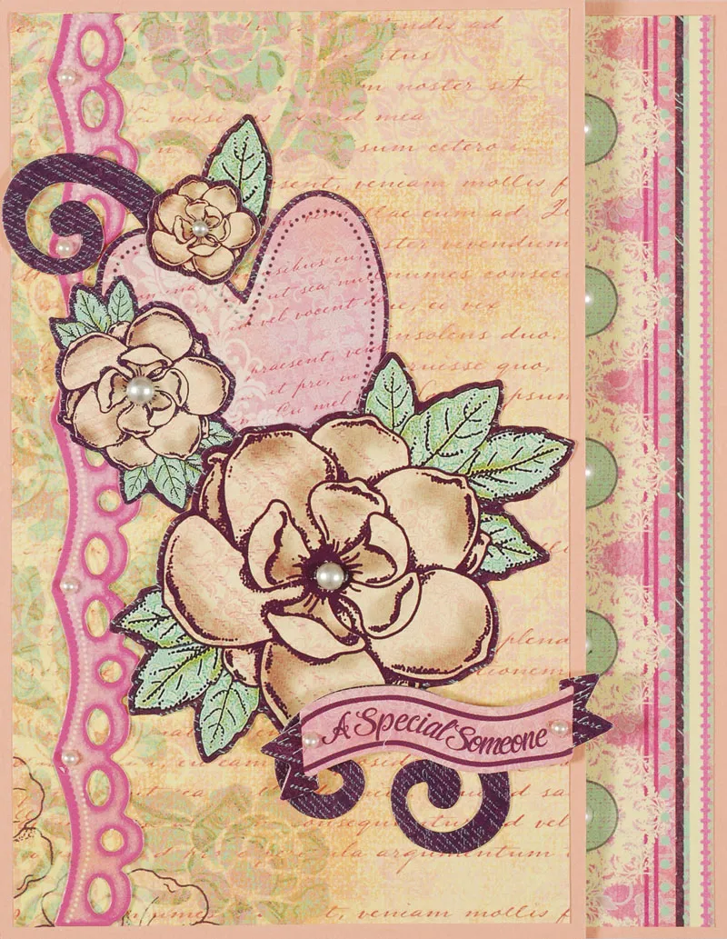 Punch out the Sorbet die-cuts shown and remove the nibs. Trim the border die-cut to 6¼" long and glue 3/8" from the left edge. Glue the remaining die-cuts except the label to the front, layered as shown. Foam tape the label at the lower right, then place the pearls as shown.