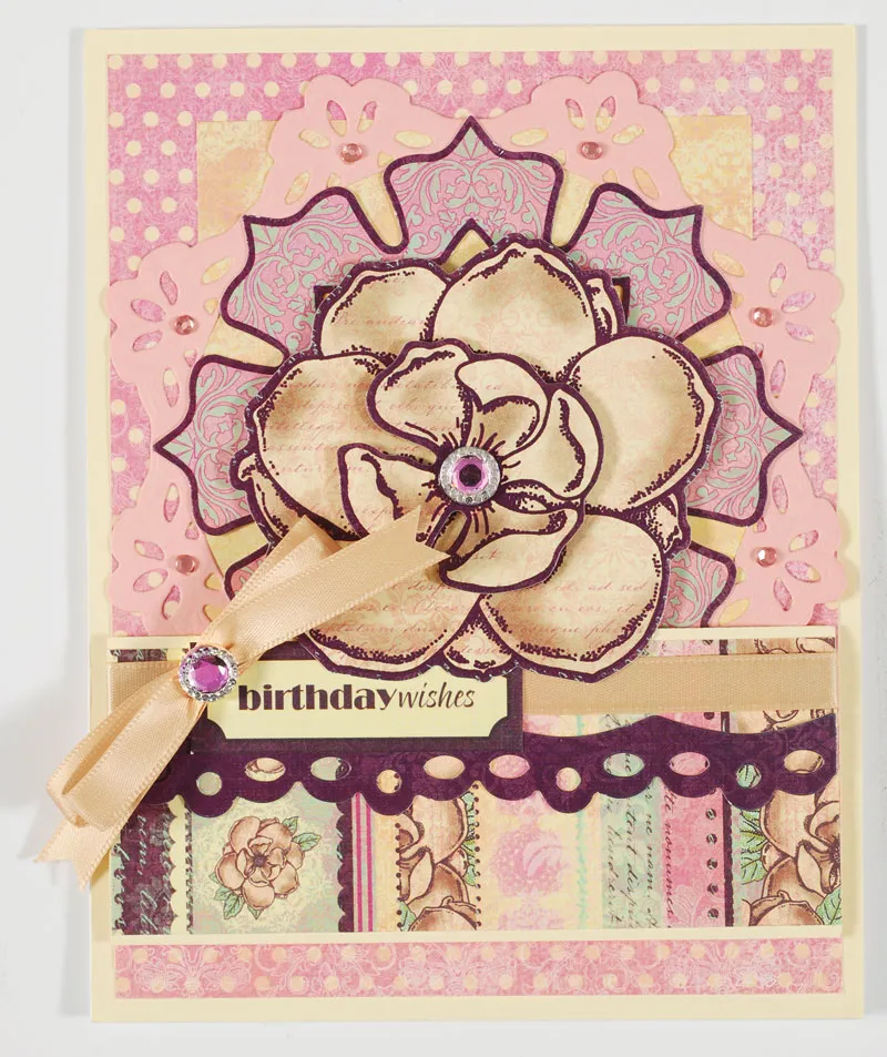 Cut out Sorbet “birthday wishes” label and glue to the ribbon, 5/8" from the left end. Punch out the Sorbet 3¼" and 1¾" flower die-cuts and remove the nibs. Foam tape the large flower in the frame center, then foam tape the small flower on top. Make a 4-loop bow and tie the center with thread, then glue to the left end of the greeting. Place the crystals as shown.