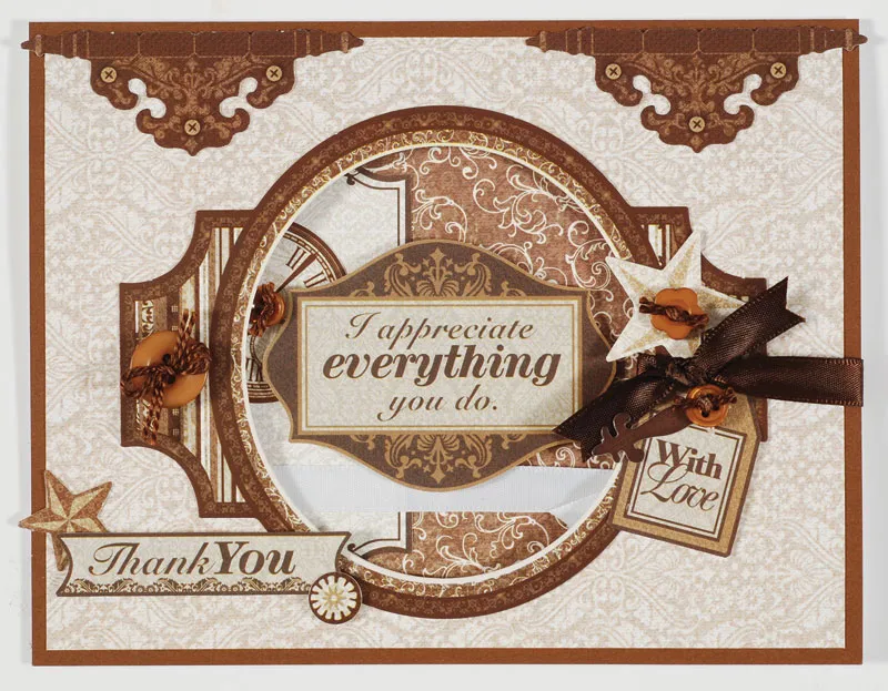 For the inside: Cut 4¾"x3½" Espresso brown swirls paper and mat on cardstock with 1/16" borders. Wrap white ribbon around it and knot on the lower right. Glue centered on the inside. Cut out Espresso large blank and “I appreciate everything…” labels. Punch out the 1½" watch die-cut and remove the nibs. Glue the blank label and watch as shown, tucking the label under the ribbon. Foam tape the sentiment to the center.