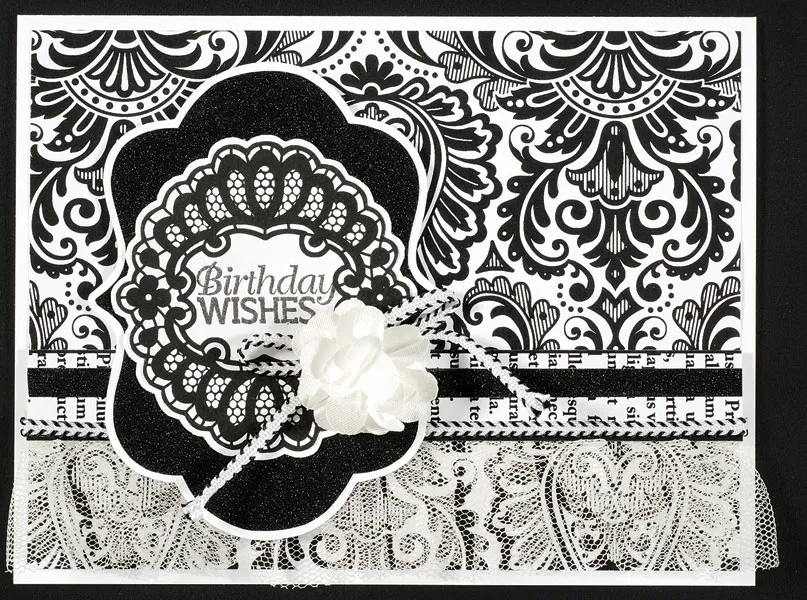 Trace and cut a 3"x4" vintage label from black glitter paper and mat on cardstock with 1/16" borders. Cut out the 2 5/8" Color Me™ lacy label with a 1/16" white edge. Stamp “birthday wishes” on the label, then glue it to the glitter label. Foam tape to the front, 5/8" from the left edge. Tie a bow with trim, then glue it to the label and place a flower below it as shown.