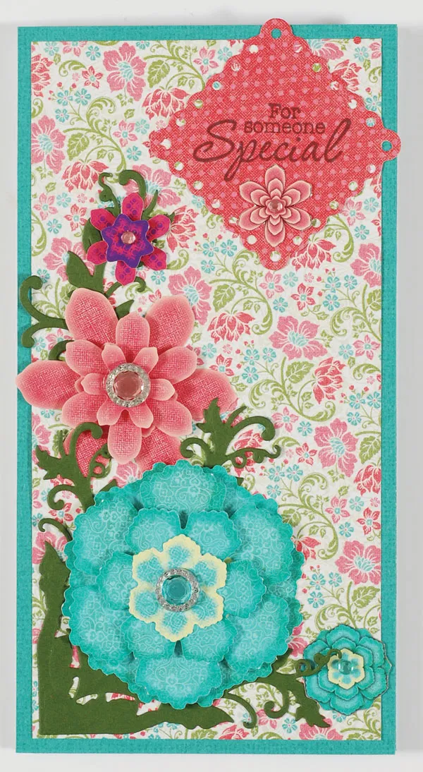 Die cut a 1½" square from Rosemary & Thyme pink dotted paper, turn on point, and stamp “For someone Special” on it. Cut out a daisy finished look sample and glue below the sentiment, then glue the square on the front at the upper right. Place crystals and rhinestones as shown.