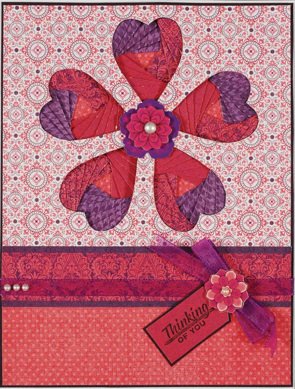 Punch out petunia #3 and glue to the iris-folded flower center. Cut out a daisy finished look flower and foam tape to the center. Make a 4-loop bow and tie the center with thread. Attach to the ribbon near the right edge with tape. Use the tags template to trace and cut squared Tag D from Rosemary & Thyme pink tiles paper, then cut ½" off the end. Stamp “Thinking OF YOU” on it, mat on cardstock with 1/32” borders, then glue under the bow. Cut out a pink finished look flower and attach to the bow center with Ultra Clear tape. Place pearls as shown.