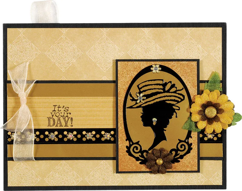Place the Dazzles™ frame on metallic gold paper and cut around the edges. Place a lady in the frame, then glue to Earth’s Palette gold leather paper. Cut to 2 1/8"x2 7/8" and mat on cardstock with 1/16" borders. Attach two gray sheer flowers at the bottom with a gold mini brad. Foam tape to the front ¾" from the right edge. Place jewel and flower Dazzles™ on the front as shown.