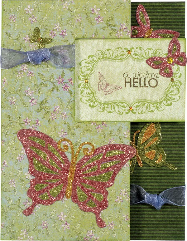 Cut a 5"x2¼" Earth’s Palette light green paper and ink the edges green. Stamp a green frame near the right end. Stamp “a warm hello” in brown and a butterfly in plum. Glue to the front swinging section.