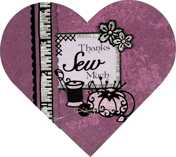 For the card front: Open the card and place the pattern on it, aligning the fold line on the pattern with the card’s center fold. Cut out and fold as directed. Cover the front with Earth’s Palette purple floral paper and ink the edges. Print “thanks” and “much” on Earth’s Palette purple vellum, stacked with ¾" between the words as shown. Trim to 2"x1½" and place “sew” Dazzle™ on it. Mat on silver linen paper with ?" borders, then mat on cardstock with 1/32"borders. Glue to the front, 1?" from the left edge.
