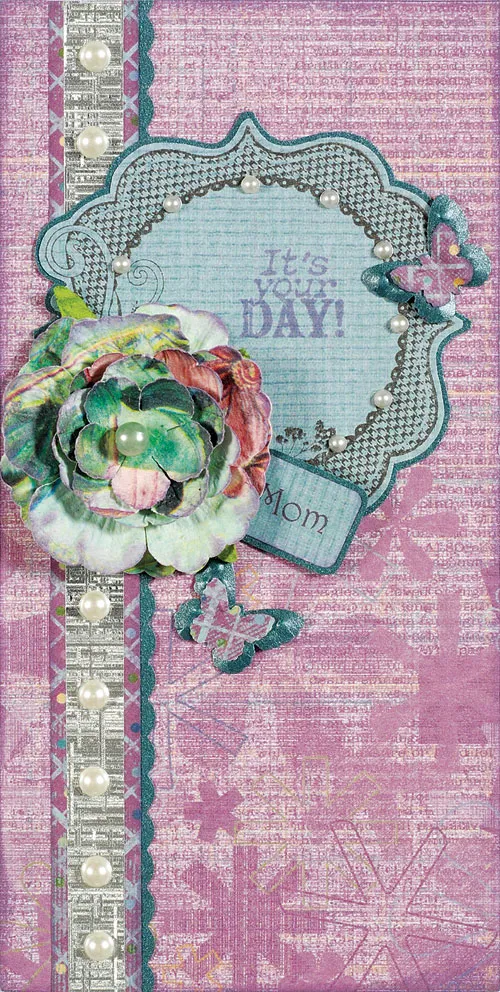 Print “Happy Mother's Day” on Earth’s Palette teal woven paper, 1¾" wide. Stamp the heart frame around the sentiment, then cut it out. Ink the edges purple and mat on Earth’s Palette teal glimmer paper with 1/32" borders. Glue to the pocket as shown. Create two more embossed butterflies and glue as shown. Punch a small tag from Earth’s Palette purple flowers paper and stamp “with love” on it. Mat on teal glimmer paper with 1/32" borders, then glue to the heart as shown. Knot the ribbon and glue to the tag, then place a 5mm pearl over it. Place 3mm pearls in stamped flowers as shown.