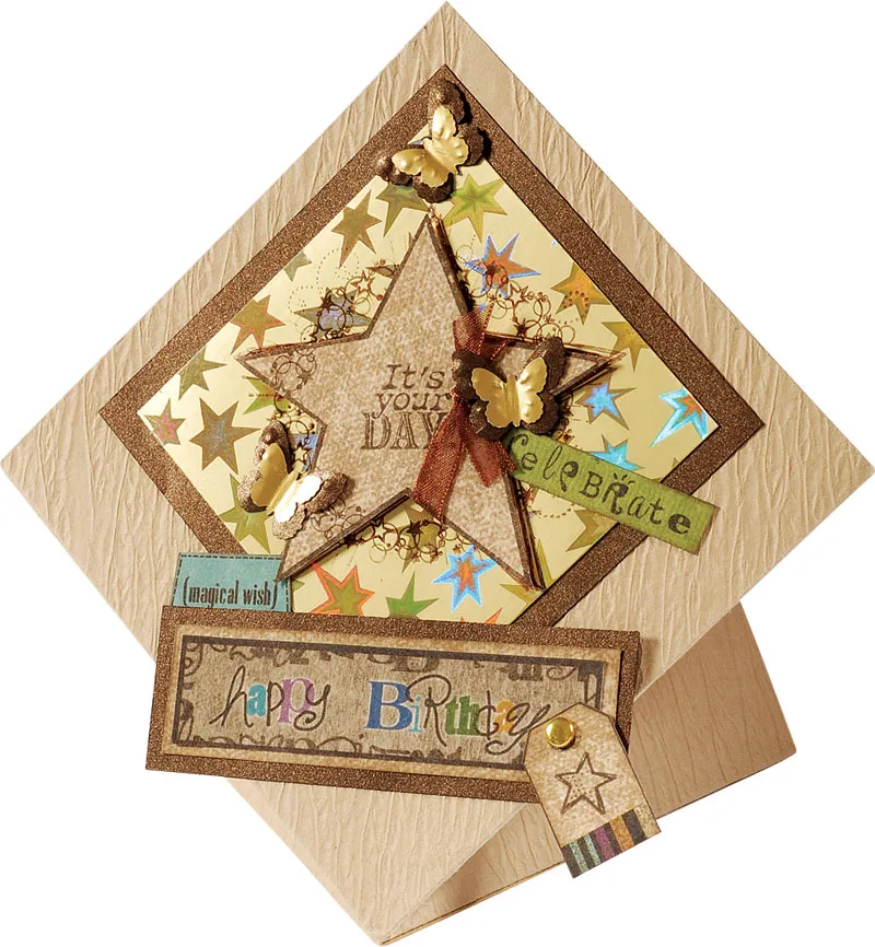 Cut out “magical wishes,” “happy birthday,” and “celebrate” word art and a 1" tan tag. Ink the edges. Mat “happy birthday” on Earth’s Palette tan textured paper with 1/16" borders and ink the edges. Mat on Earth’s Palette brown glimmer paper with ?" borders. Glue “magical wish” behind it as shown. Stamp a small star on the tag and attach to the sentiment with the as shown. Glue it and “celebrate” to the card as shown.