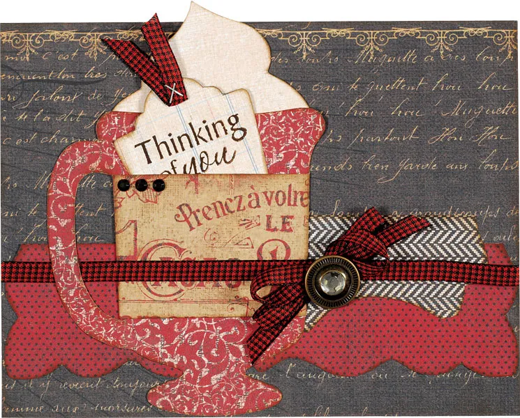 Trace and cut the mug from Noted red tapestry paper, then follow the directions to fold and glue the pocket. Trace the whipped cream onto Noted tan paper, ink the edges, and glue behind the mug so 1 1/2" extends above the rim. Glue to the front, leaving the handle unglued. Glue ribbon across the front, 1 3/4" from the bottom, tucking it under the mug handle, and gluing the ends to the back. Glue the edges of the lower front to the card.