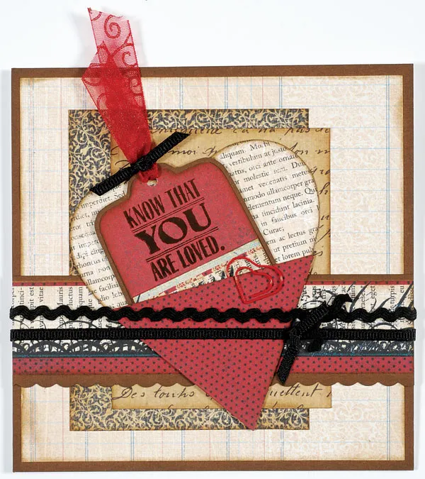 Trace and cut the square tag from Noted red paper. Cut 2"x 3/4" Noted striped paper, ink the top edge, and glue to the lower section of the tag. Trim the excess, ink the edges, then mat the tag on cardstock with 1/32" borders. Punch a hole in the top and thread a 4 1/2" red sheer swirls ribbon through it. Knot black grosgrain ribbon around the sheer ribbon, then insert the tag into the pocket.
