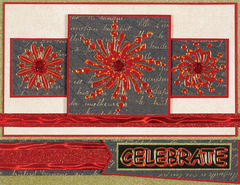 Trace and cut a banner from Noted black writing paper, then mat on red cardstock with 1/32" borders. Place the Dazzles™ “celebrate” on black cardstock and trim to 3"x 5/8". Mat on gold glitter paper with 1/32" borders, then glue centered on the banner. Glue to the lower border, aligning the right edges. Cut 3"x2 7/8" Noted black writing paper and mat on ripple paper with 1/8" borders. Mat on red cardstock with 1/32" borders, then place a large Dazzles™ fireworks burst in the center. Glue at the center top and place the remaining Dazzles™ as shown.